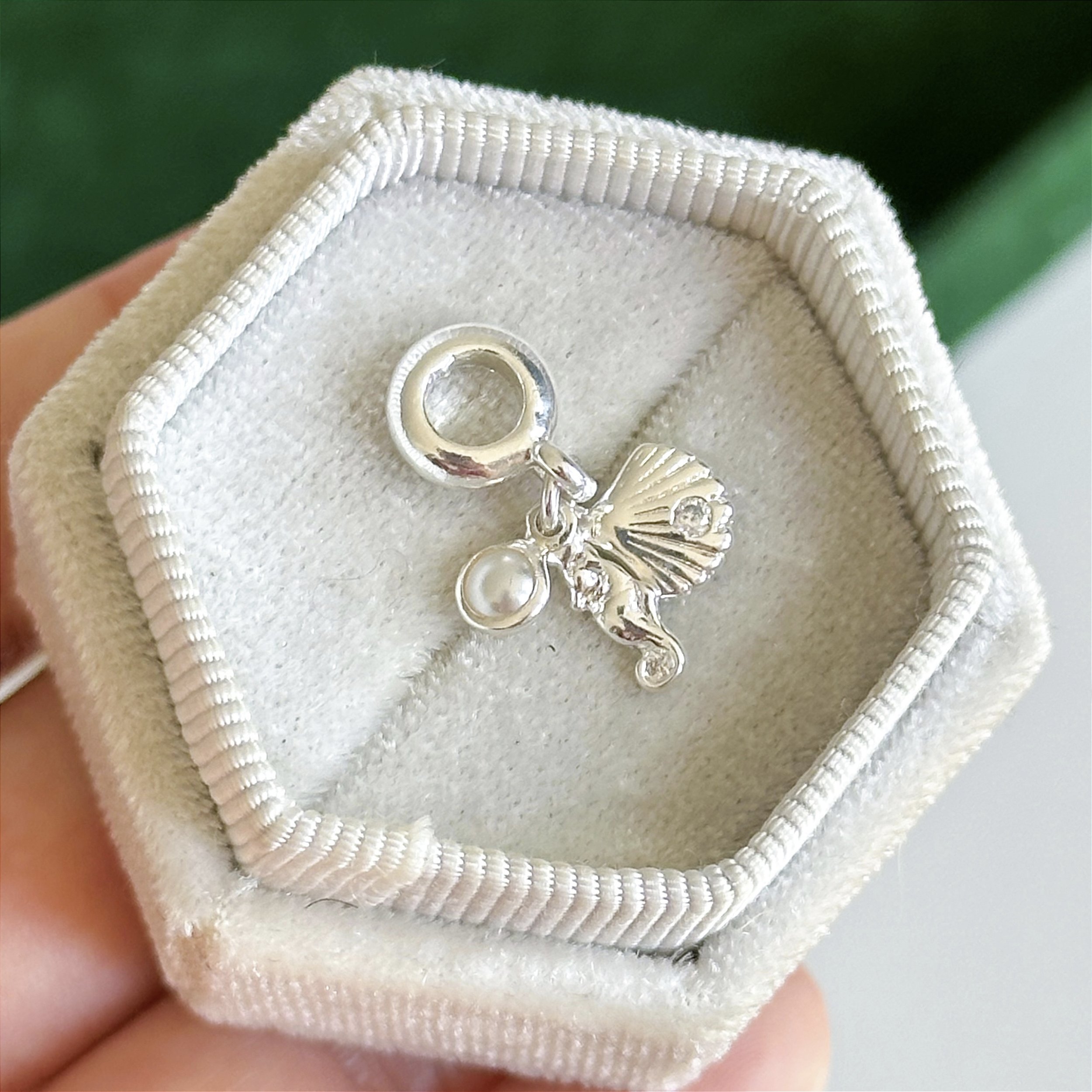 Acompanham 3 pingentes: 01 mini cavalo marinho, 01 mini concha com ponto de luz, 01 mini pérola.